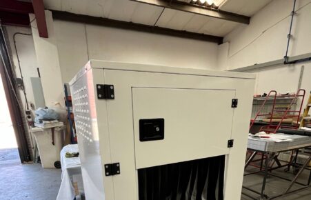 Diesel generators featuring punched louvers for ventilation and airflow. This fabrication consist of 4 formed side panels sitting on a skid fabrication with forklift pockets.