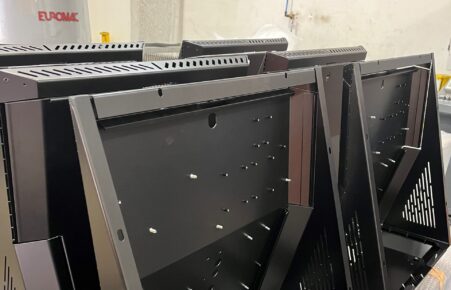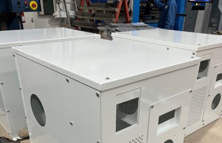 Powder coated battery boxes that have been manufactured and assembled. These have been laser cut, punched, folded, pem-serted, welded and powder coated before being assembled and dispatched.